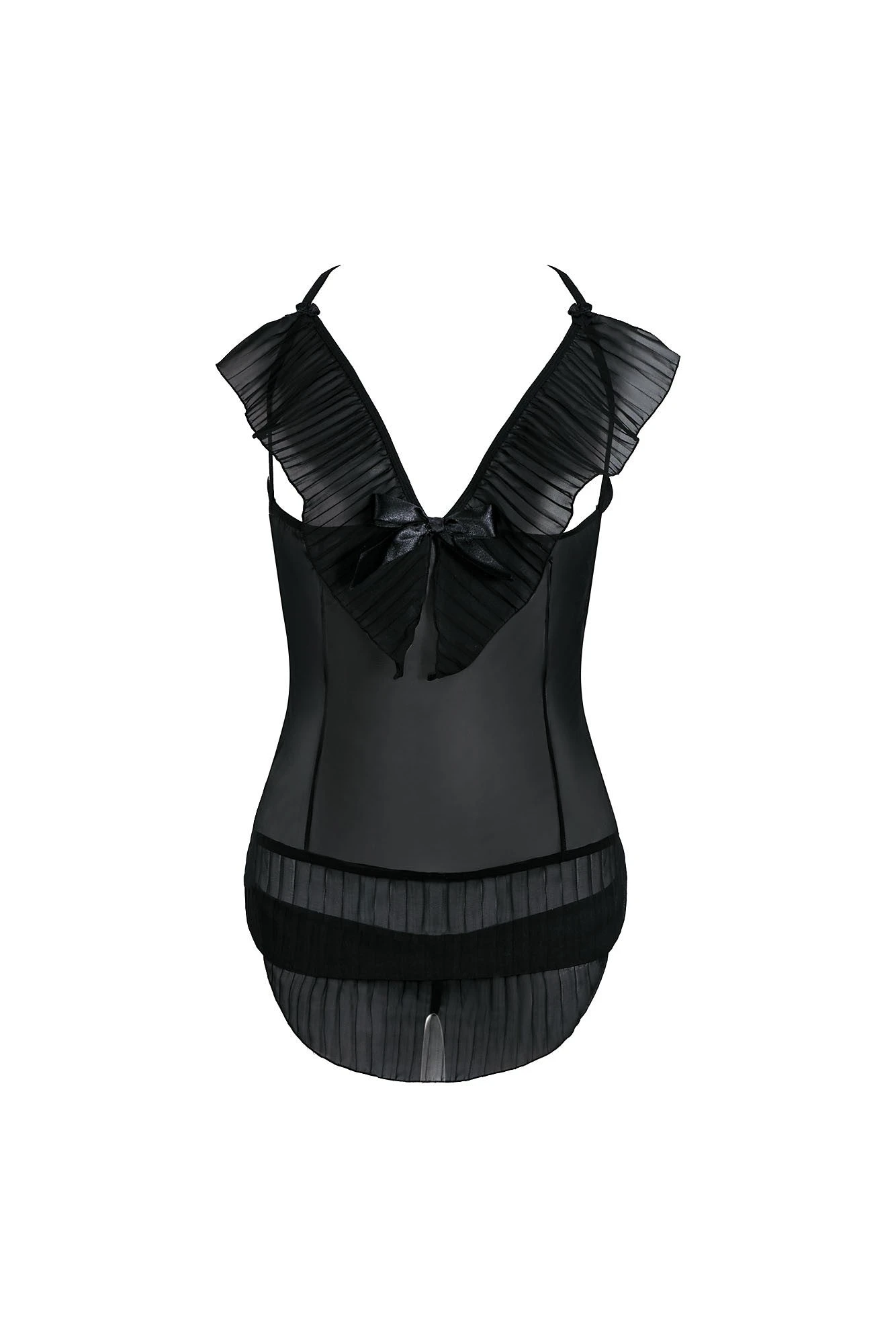 Très coquine, votre poitrine ne sera recouverte que partiellement par un volant de voile plissé taillé en V qui met en valeur la poitrine. Le volant se prolonge jusqu’au ventre et en son centre est posé un nœud de satin noir.