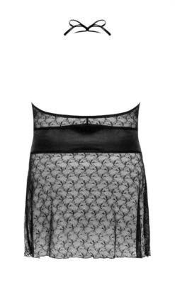 Le dos est laissé nu sur une large partie haute, ce qui donne encore plus de charme à la nuisette. Les bretelles passant sur la nuque, rien ne viendra cacher le moindre centimètre du haut du dos. La nuisette sera parfaitement ajustée grâce à un nœud de maintien des bretelles sur la nuque.