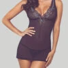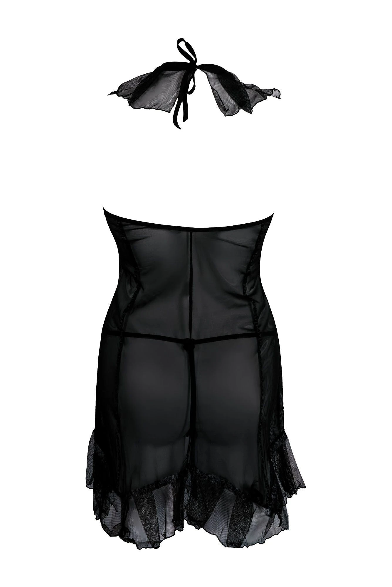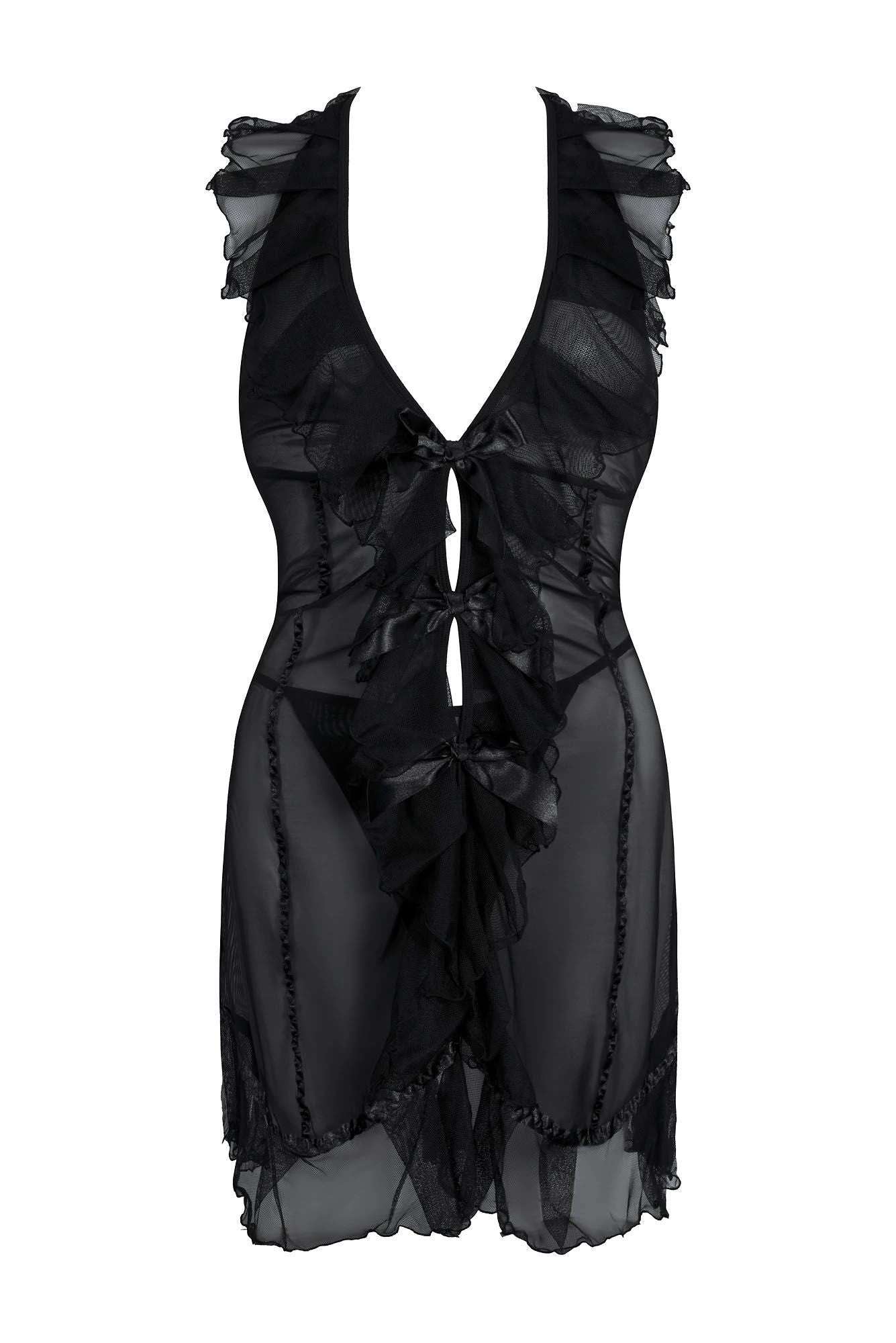Résille transparente sur l’intégralité de la nuisette. Décolleté profond mis en valeur par un volant large qui trace le contour du décolleté.