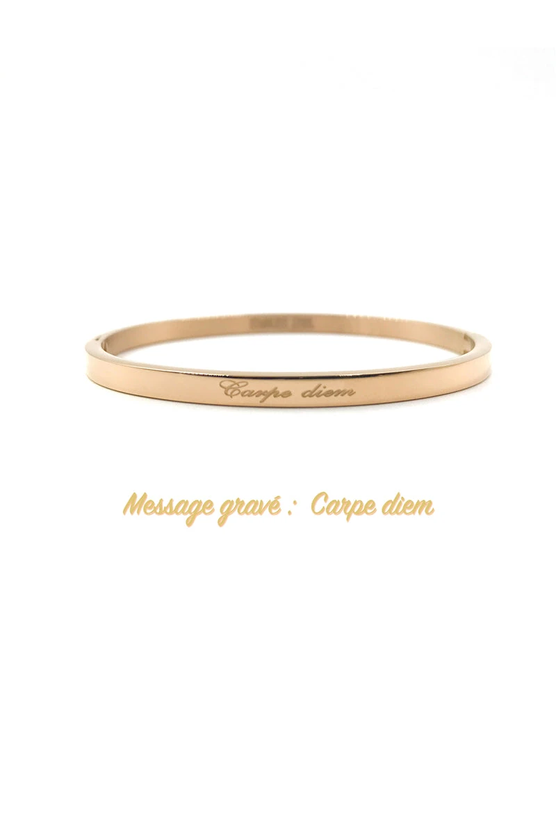 Fabriqué en acier inoxydable, il présente des tons or rose élégants qui captent la lumière de manière attrayante. Le bracelet a un diamètre de 19 cm et est facilement ajustable grâce à sa fermeture facile à fixer, tandis que « Carpe diem » – qui signifie « saisis le jour » en latin – complète son design qui donne à réfléchir.