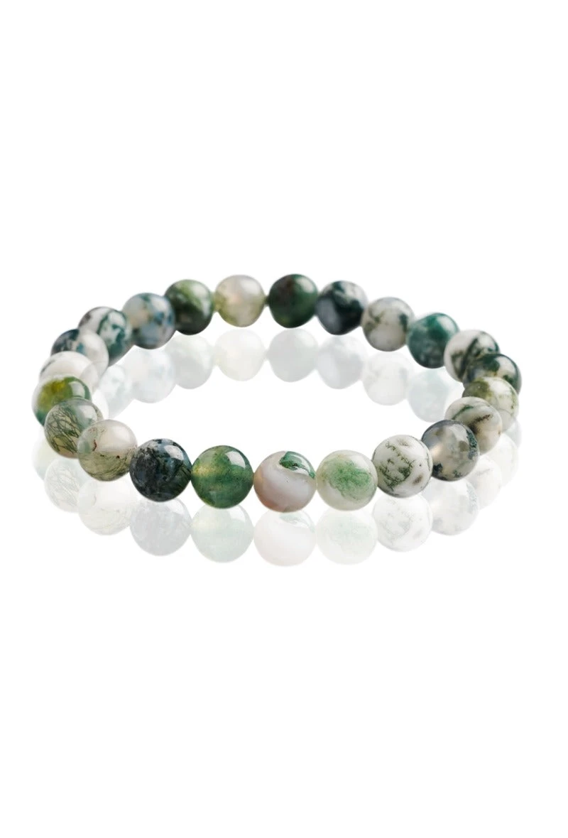 Avec des boules d’agate mousse de 8 mm de diamètre, ce bracelet confère un air de sophistication dont aucune femme ne devrait se passer.
