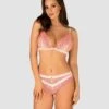 Cet ensemble est composĂ© du string avec ouverture coquine Ă l’entrejambe, avec sa fine lanière de maintien dĂ©corĂ©e de deux noeuds de satin aux intersections.