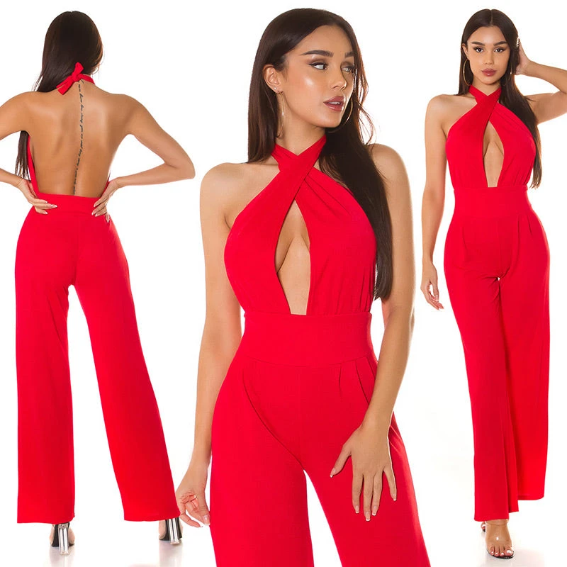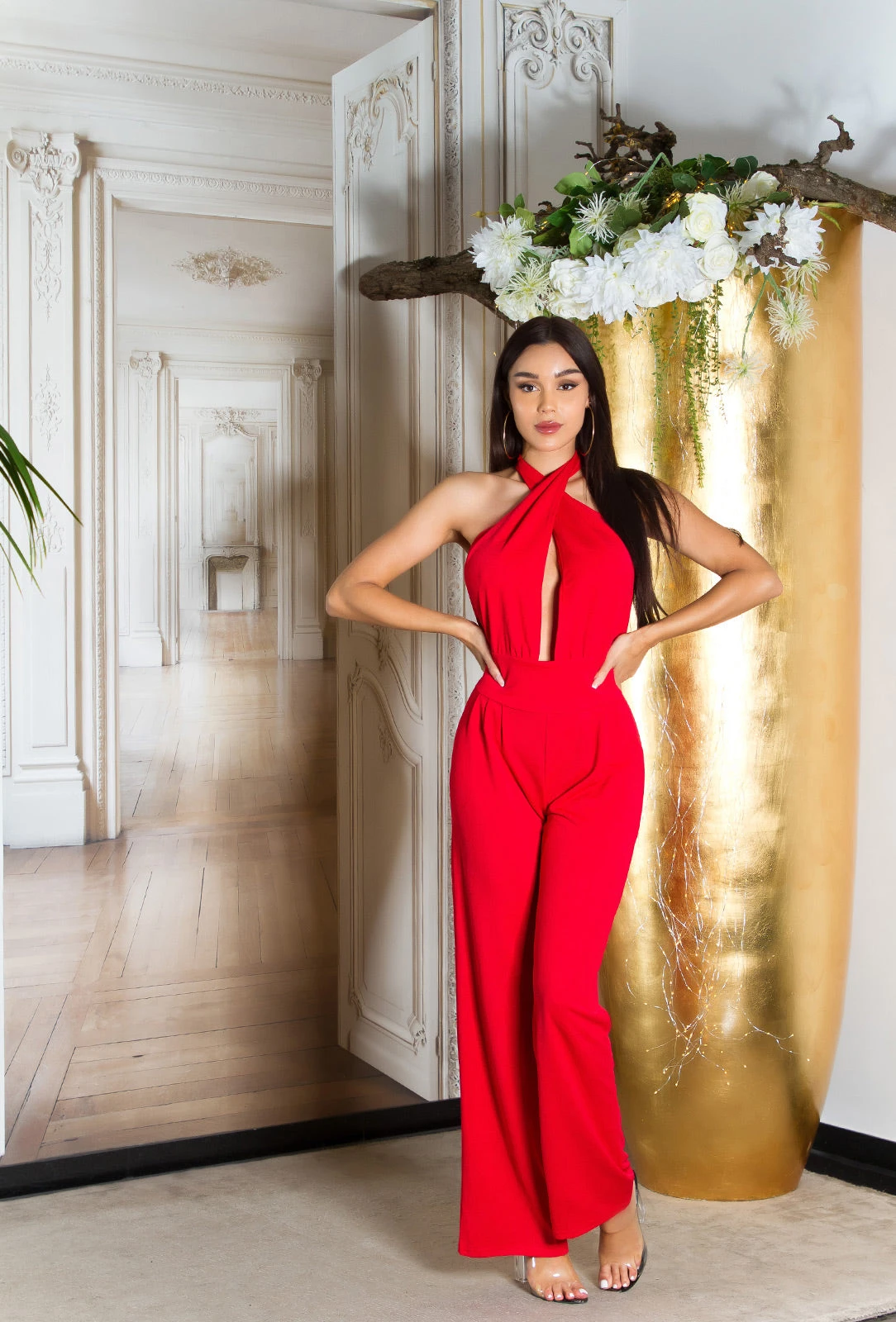 Avant coeur croisé à nouer sur la nuque. Une combinaison longue élégante que vous retrouverez aussi en motif léopard pour celles qui veulent mettre un peu de fantaisie à leur tenue.