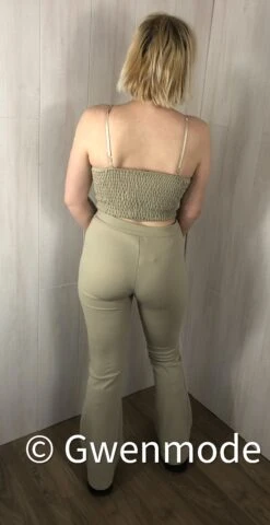 Le pantalon est lui maintenu sur la taille par une bande élastique. Le bas du pantalon est stylé pattes d’éléphant.