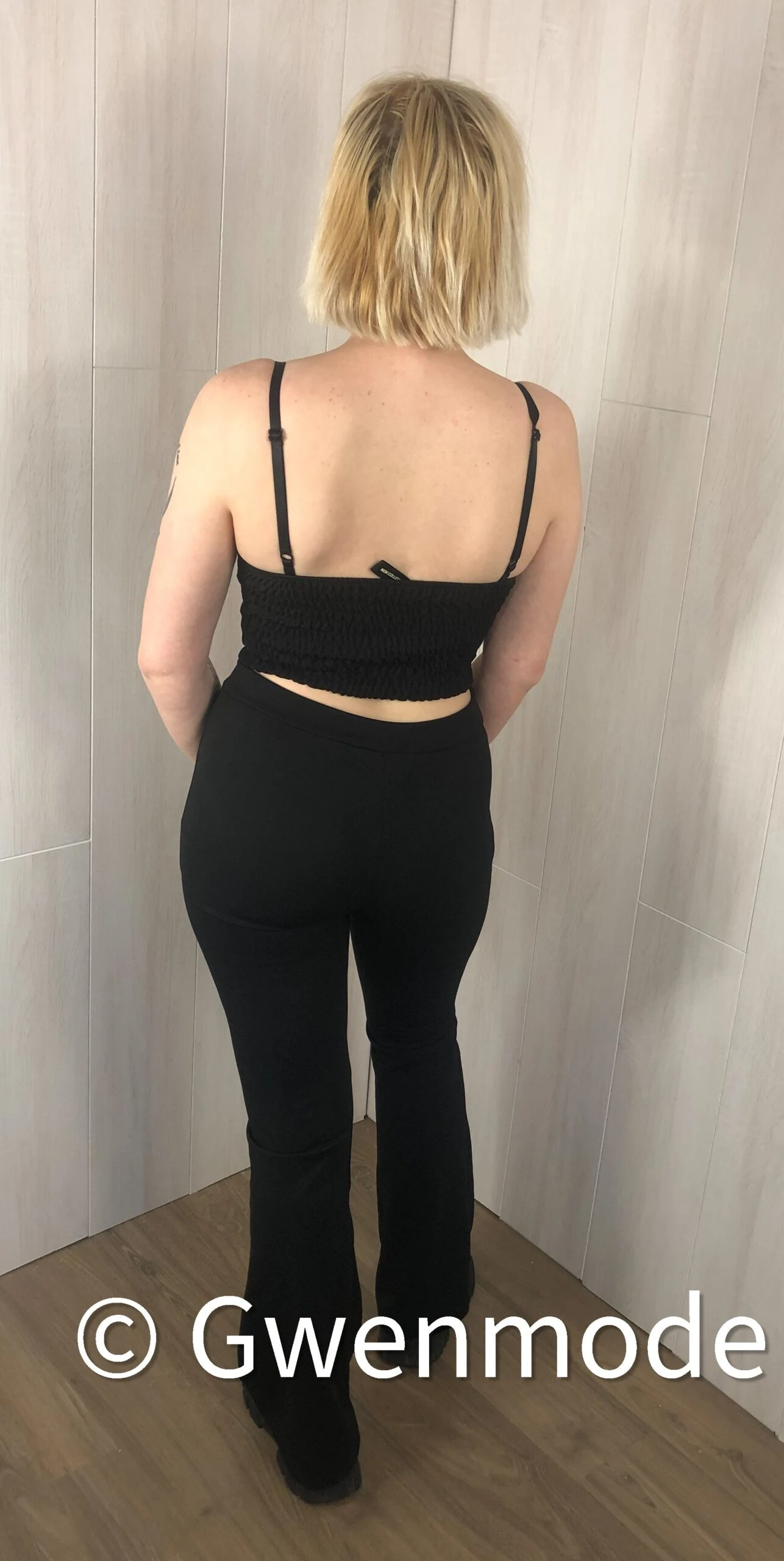 Top court stylĂ© crop top près du corps. Avec bretelles fines rĂ©glables. Les bonnets sont pourvus de mousses (non amovibles). Au niveau de la taille, sur l’arrière le tissu est très Ă©lastique et fait d’un tissu froncĂ©. L’avant est lui en tissu noir opaque.