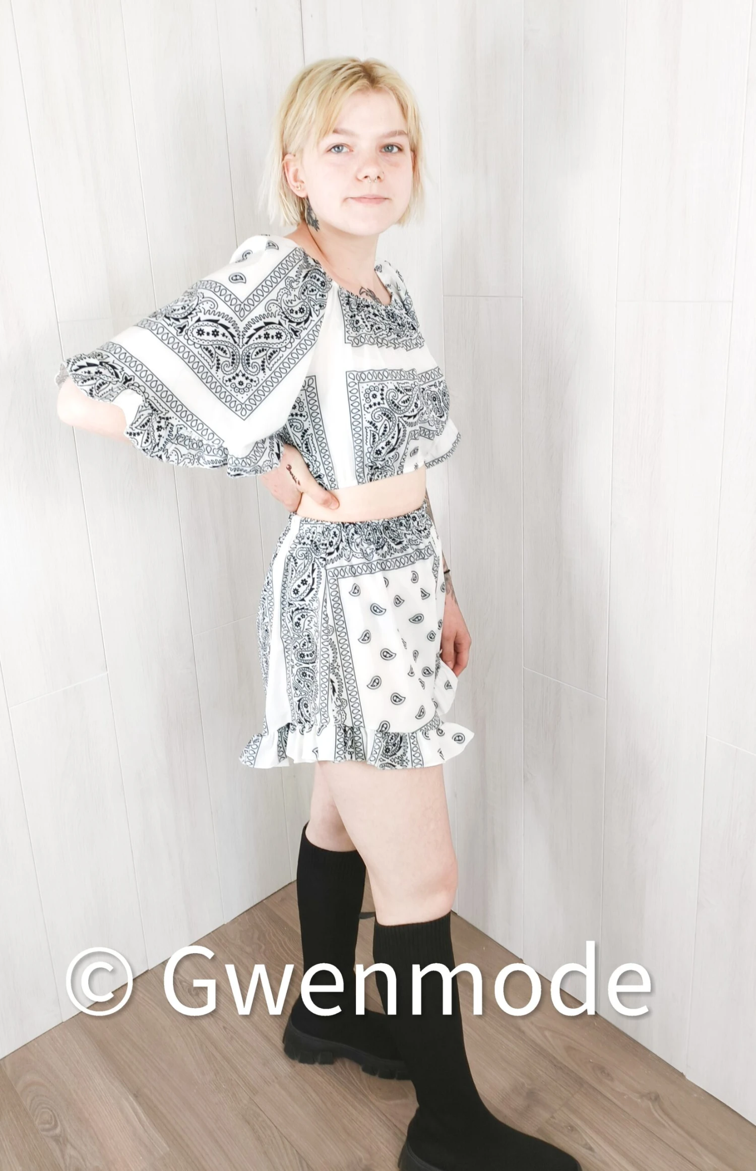 Coloris blanc, article en taille unique. Les motifs sont en coloris noir en joli contraste de couleurs. Cet ensemble existe aussi en couleur noire et blanc (motifs blancs sur fond noir) sur notre site internet de vente de vĂŞtements pour femme et dans notre boutique Ă Douai.