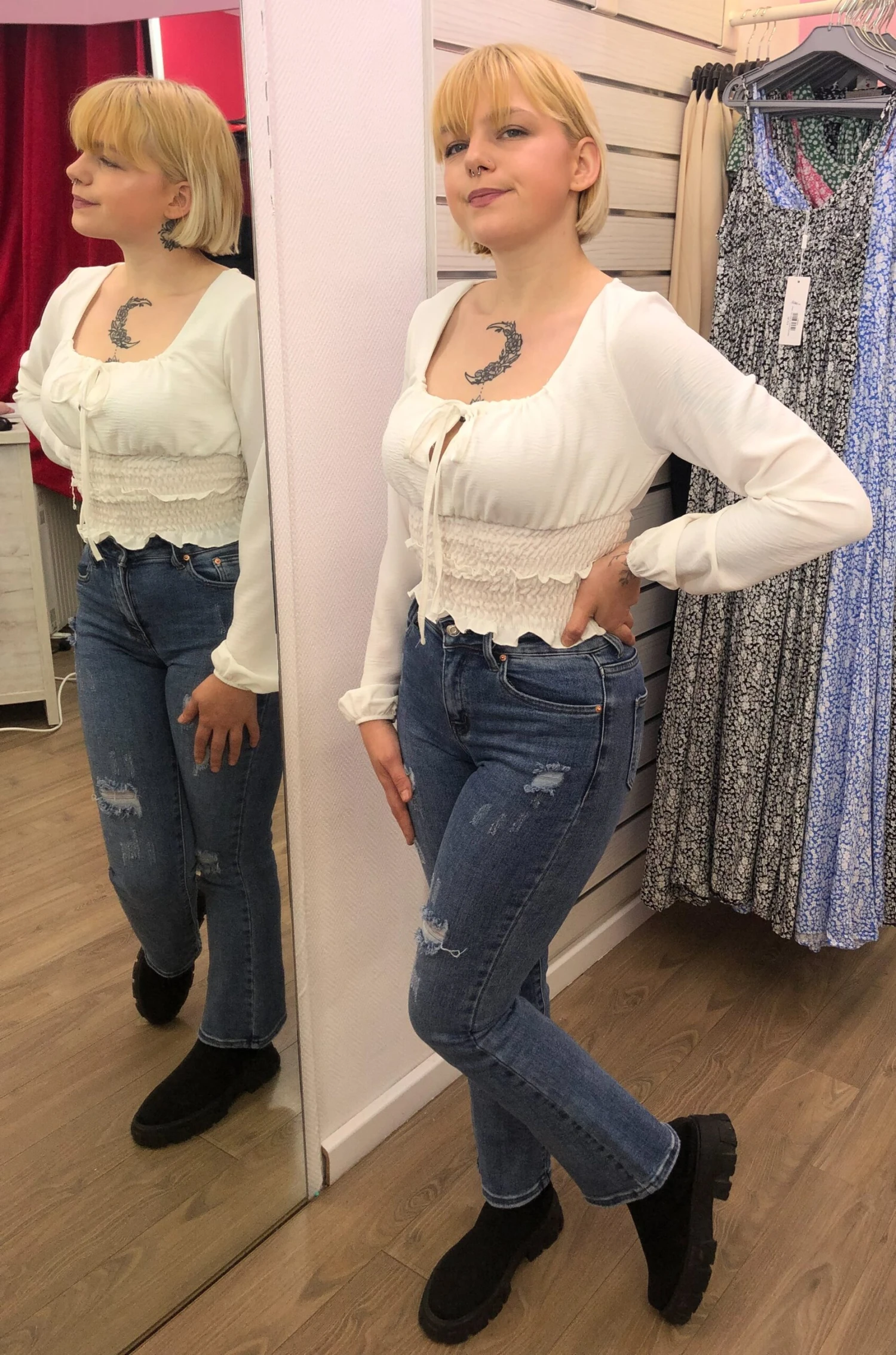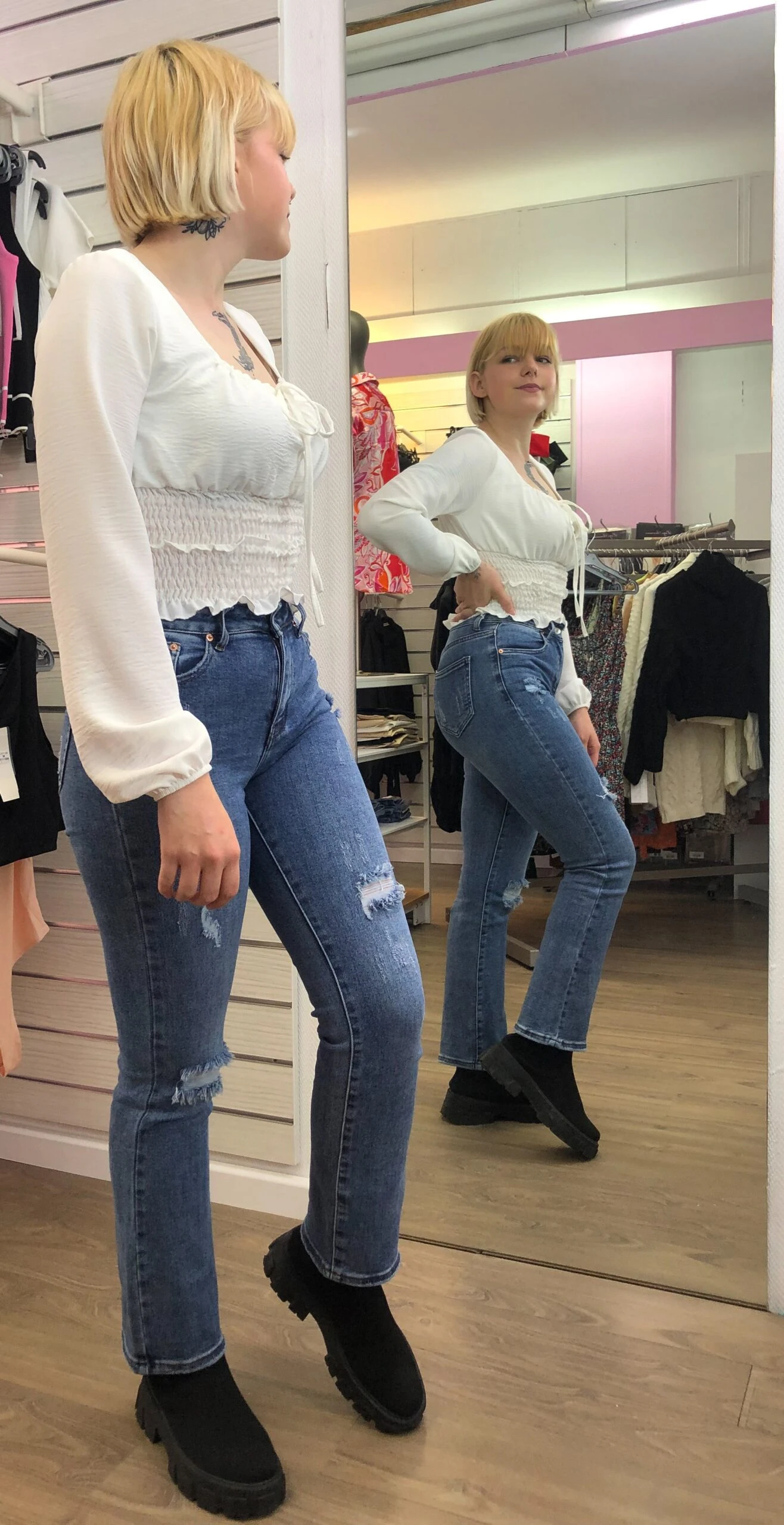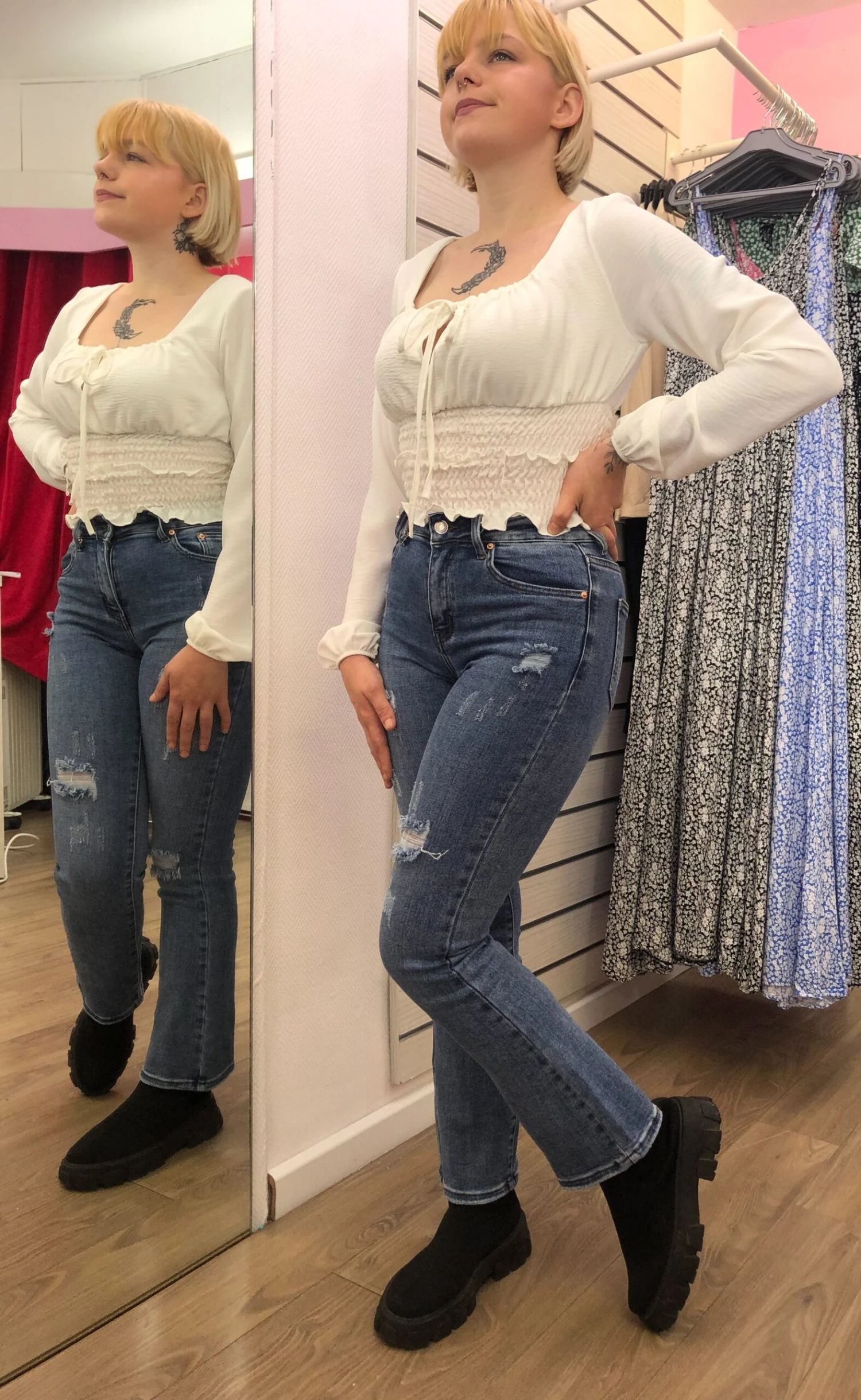 Pour la photo, Gwendoline porte un top froufrou que vous trouverez dans notre boutique dans différents coloris.