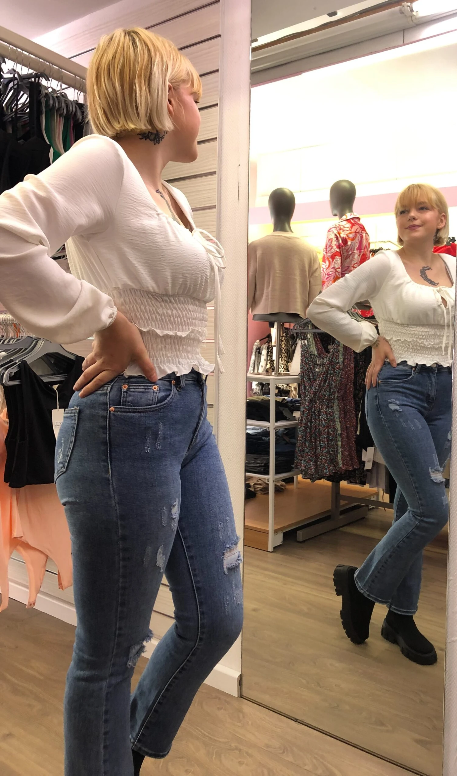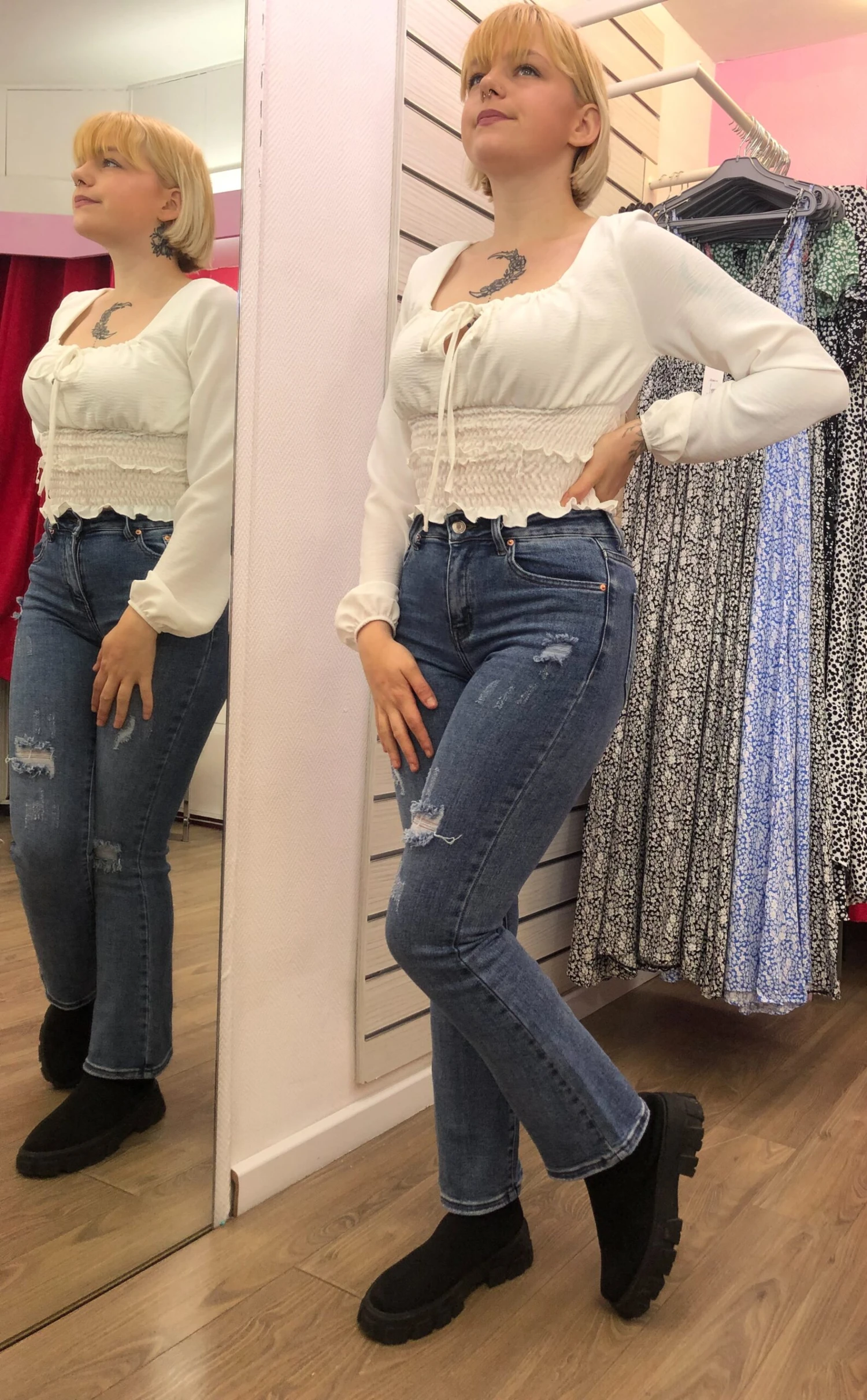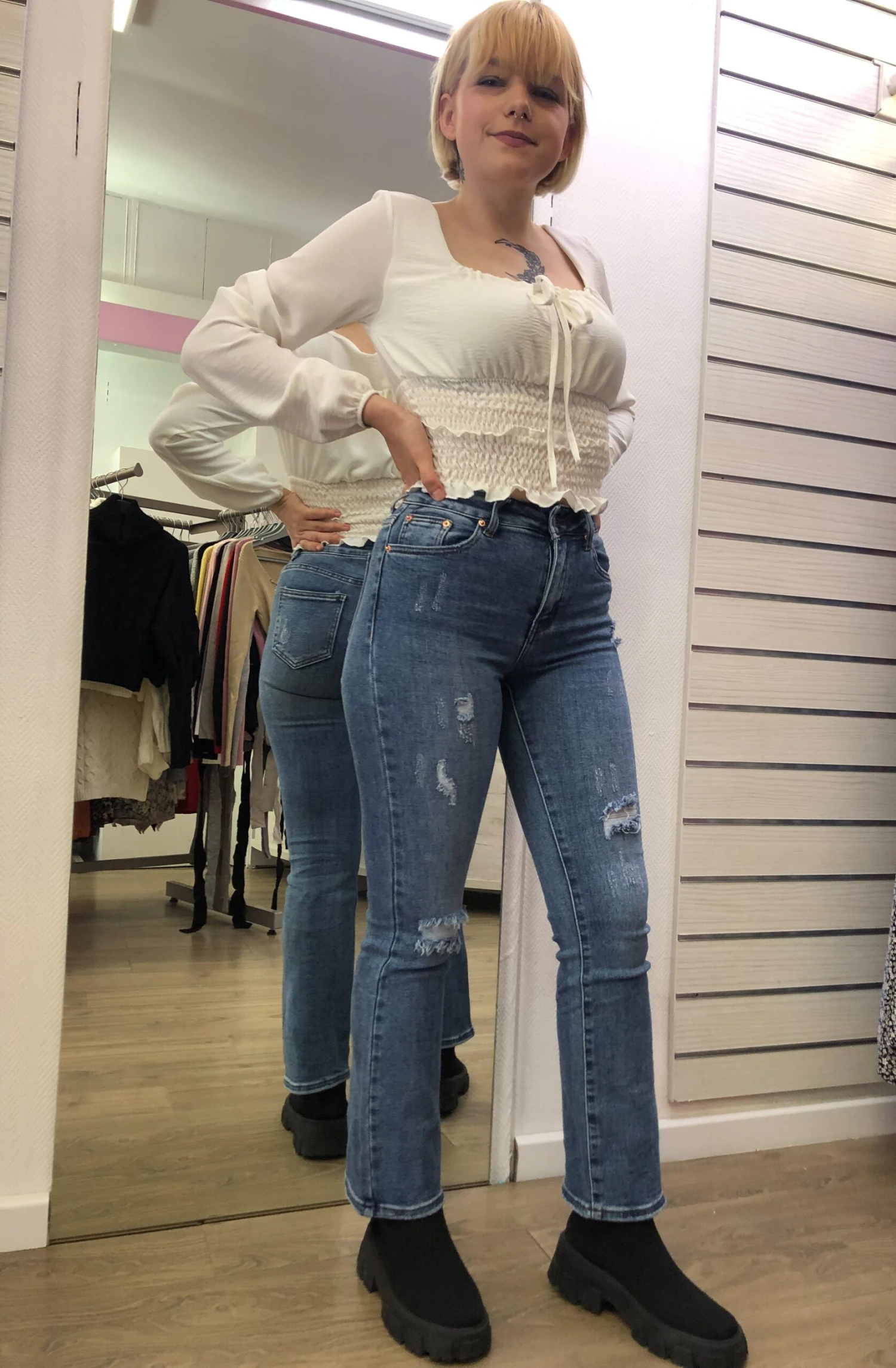 Pour la photo, Gwendoline porte un top froufrou que vous trouverez dans notre boutique dans différents coloris.