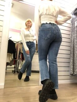 Taille regular pour ce jean pour femme. Le modèle qui porte le jean mesure 1.65m et porte un jean taille 36.