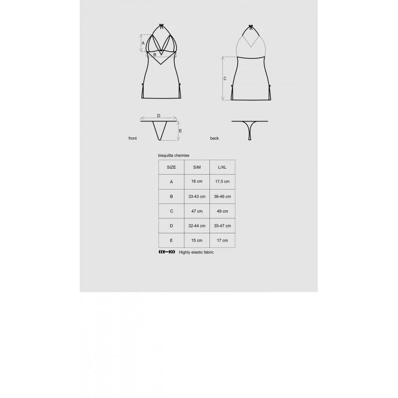 Des lanières blanches vont dessiner la poitrine, lanières qui vont aussi passer sous les seins. Cette nuisette est recommandée pour des femmes ayant au moins un bonnet B.