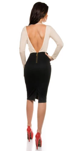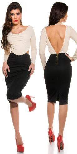 Robe de soirée stylée deux pièces avec son haut beige et le bas façon jupe en coloris noir.