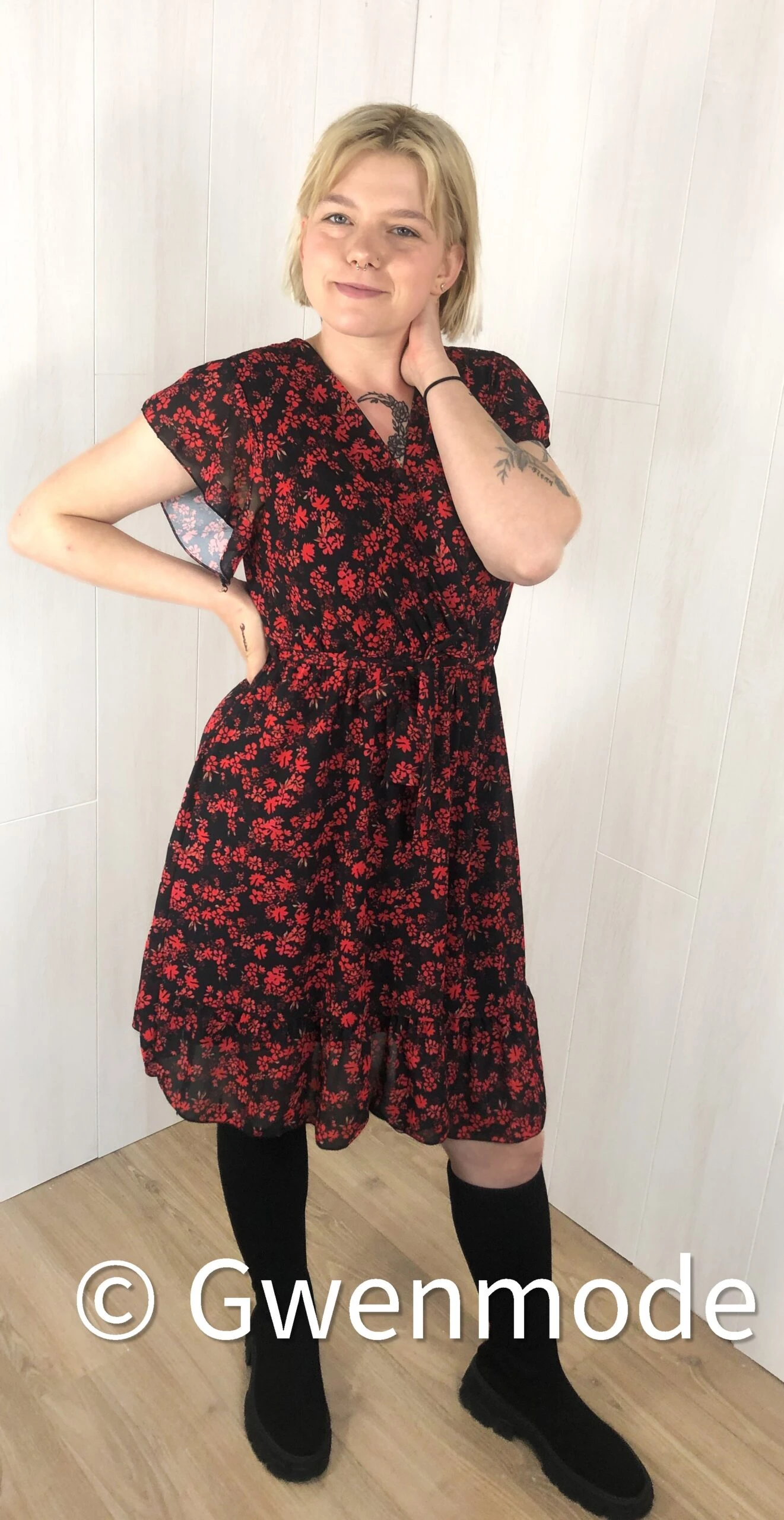 Disponible en Orange ou en rose sur notre site, cette robe est ici en coloris noir avec des fleurs rouges en motif.