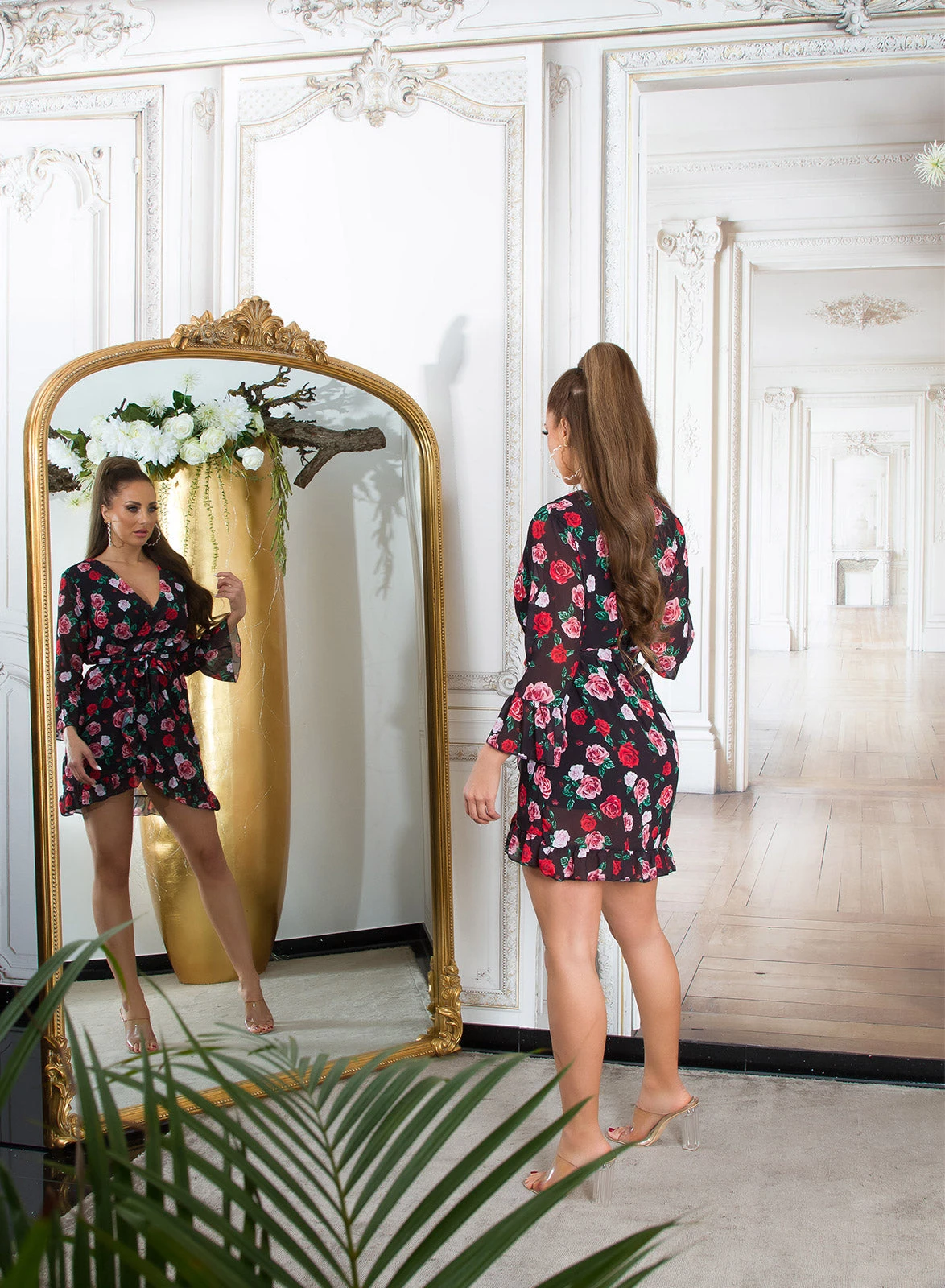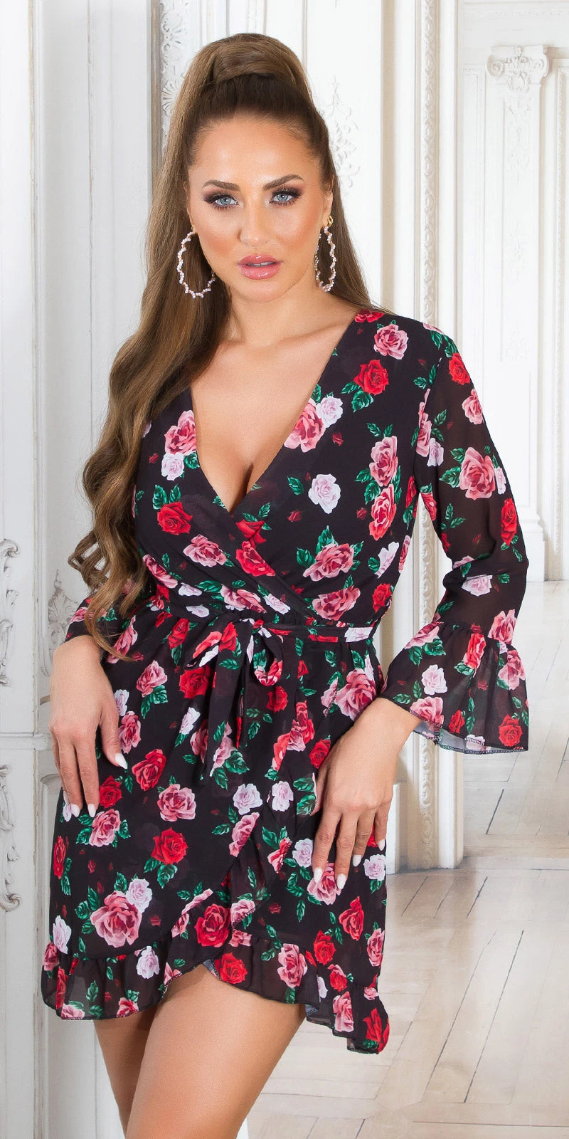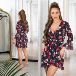 La robe est ornée de détails original la rendant forte comme pièce. Les fleurs, la ceinture à la taille, les manches longues et larges vers les poignets ainsi que l’effet jupe porte feuille grâce aux volants. Coup de coeur assuré.