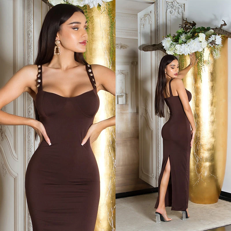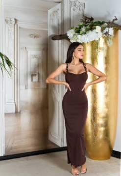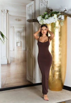 Robe longue dans un coloris brun qui change des couleurs traditionnelles. Une robe que vous allez adorer porter lors de vos sorties en soirée.