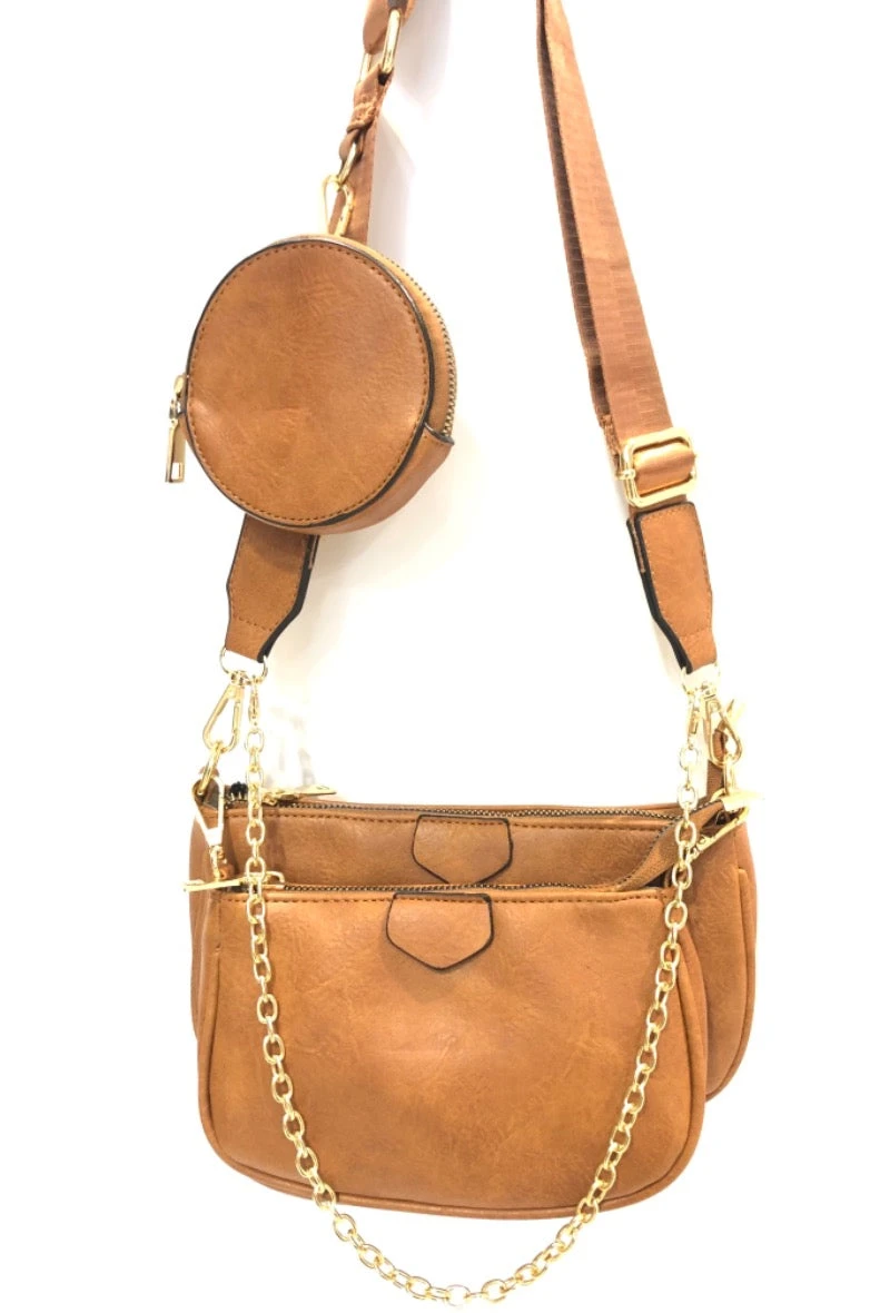 Sac Ă main avec sa pochette et son porte monnaie assortis.