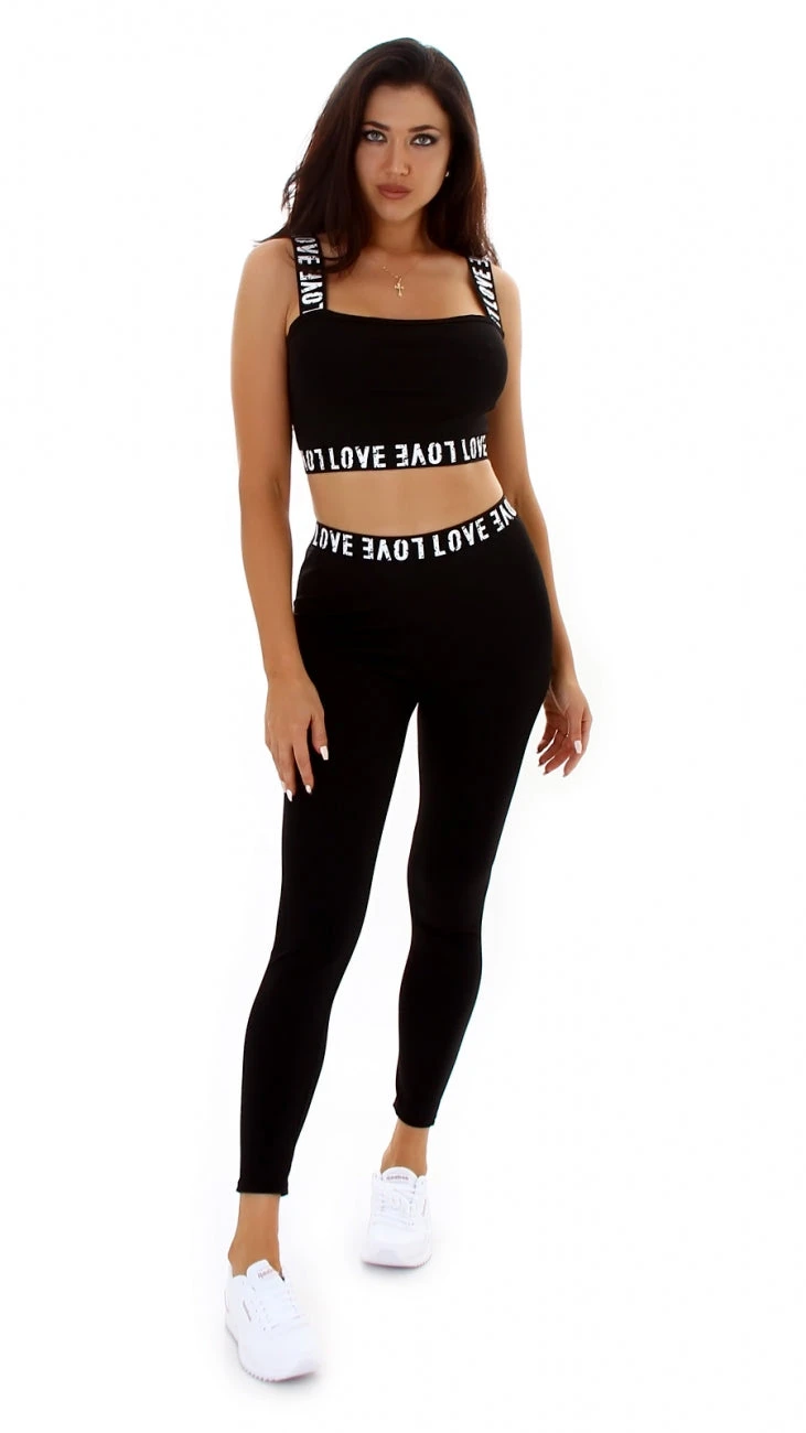 Le legging ainsi que le top ont une bande avec inscription LOVE en blanc dessus. les bandes permettent un bon maintien et rajoute une touche retro à la tenue.